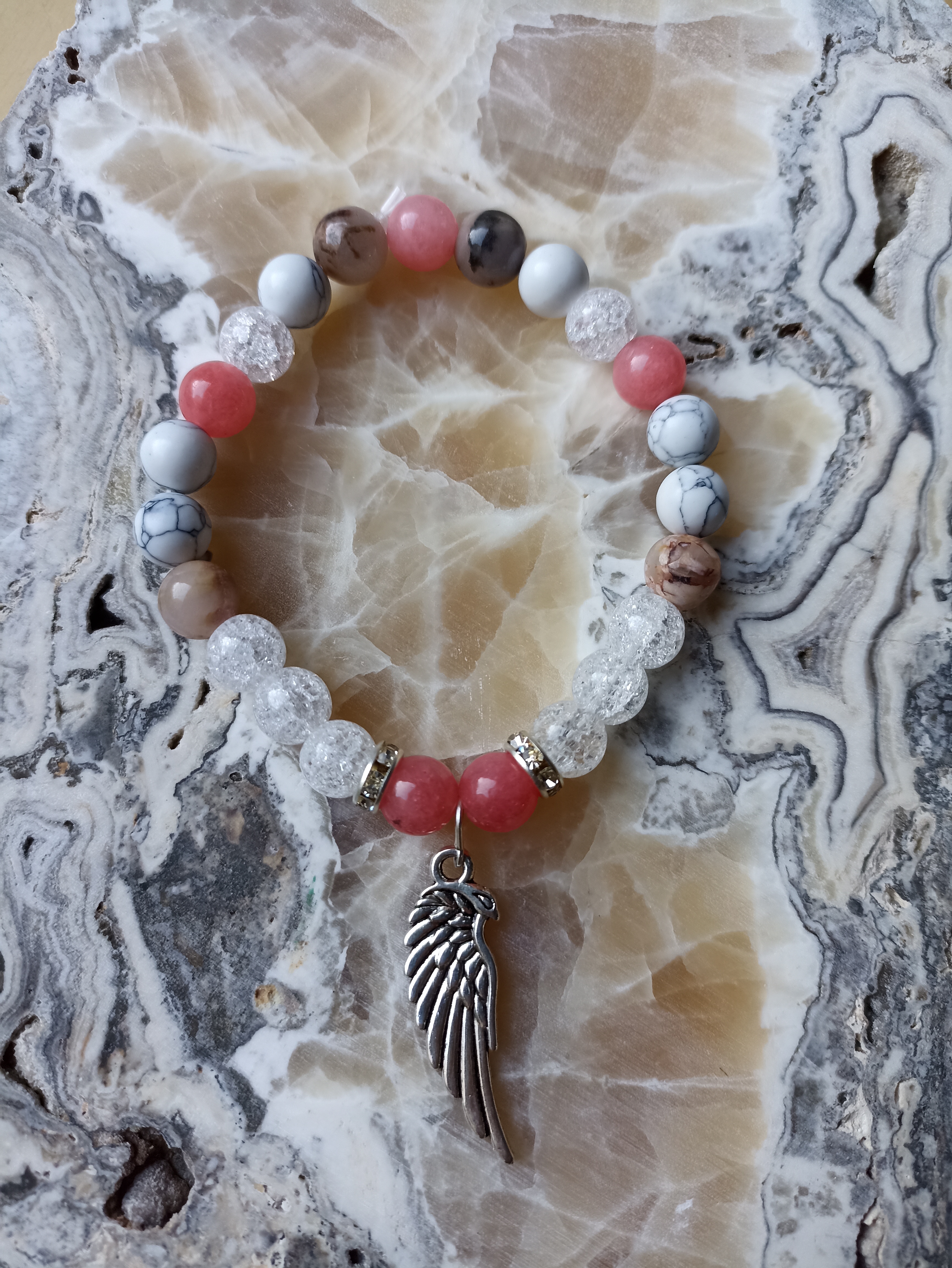 Materiál: Rodonit, Howlit, růžový chalcedon, praskany Křišťál.